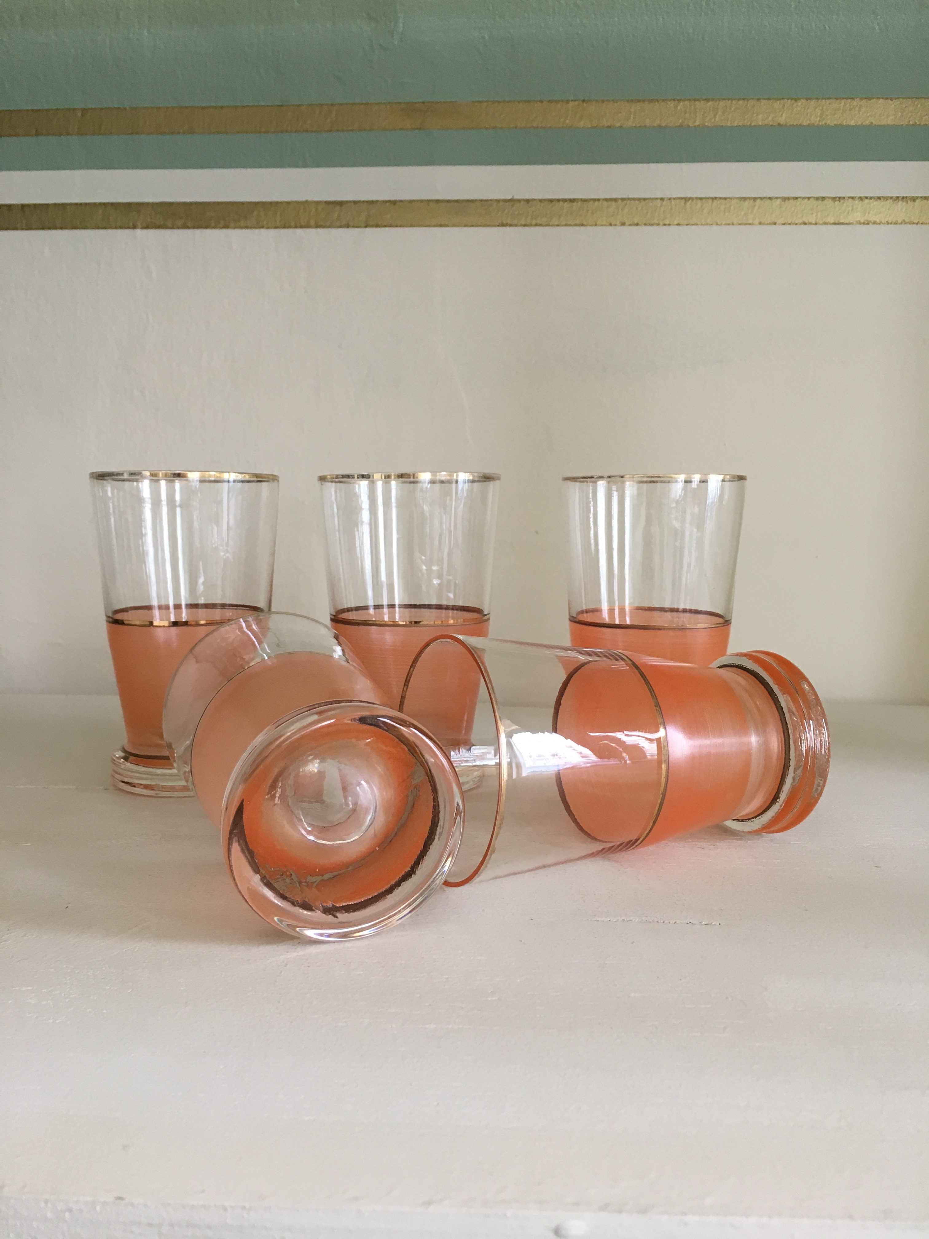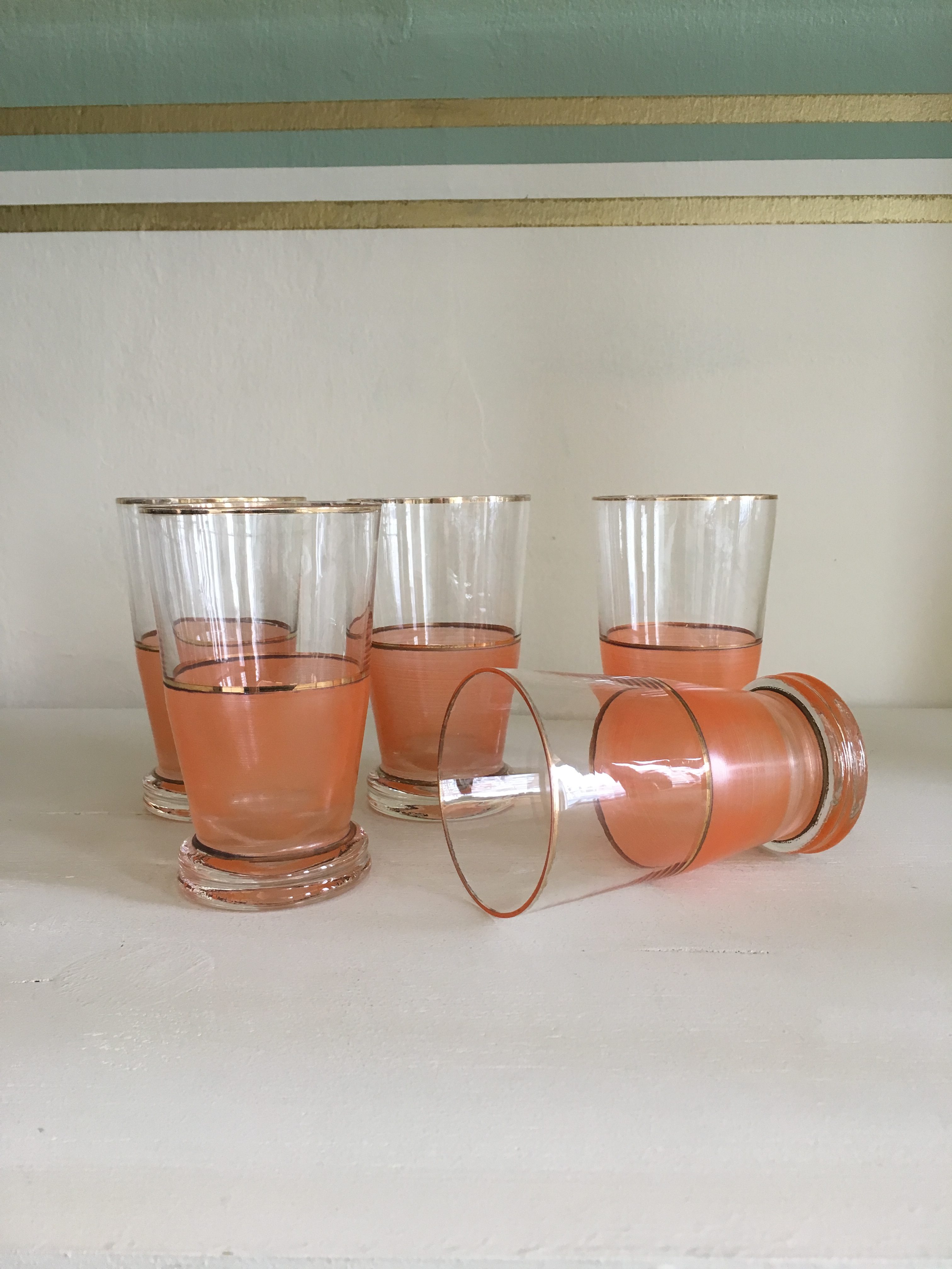 Set of 5 glasses of water or soft drink in satin coral glass with golden edge