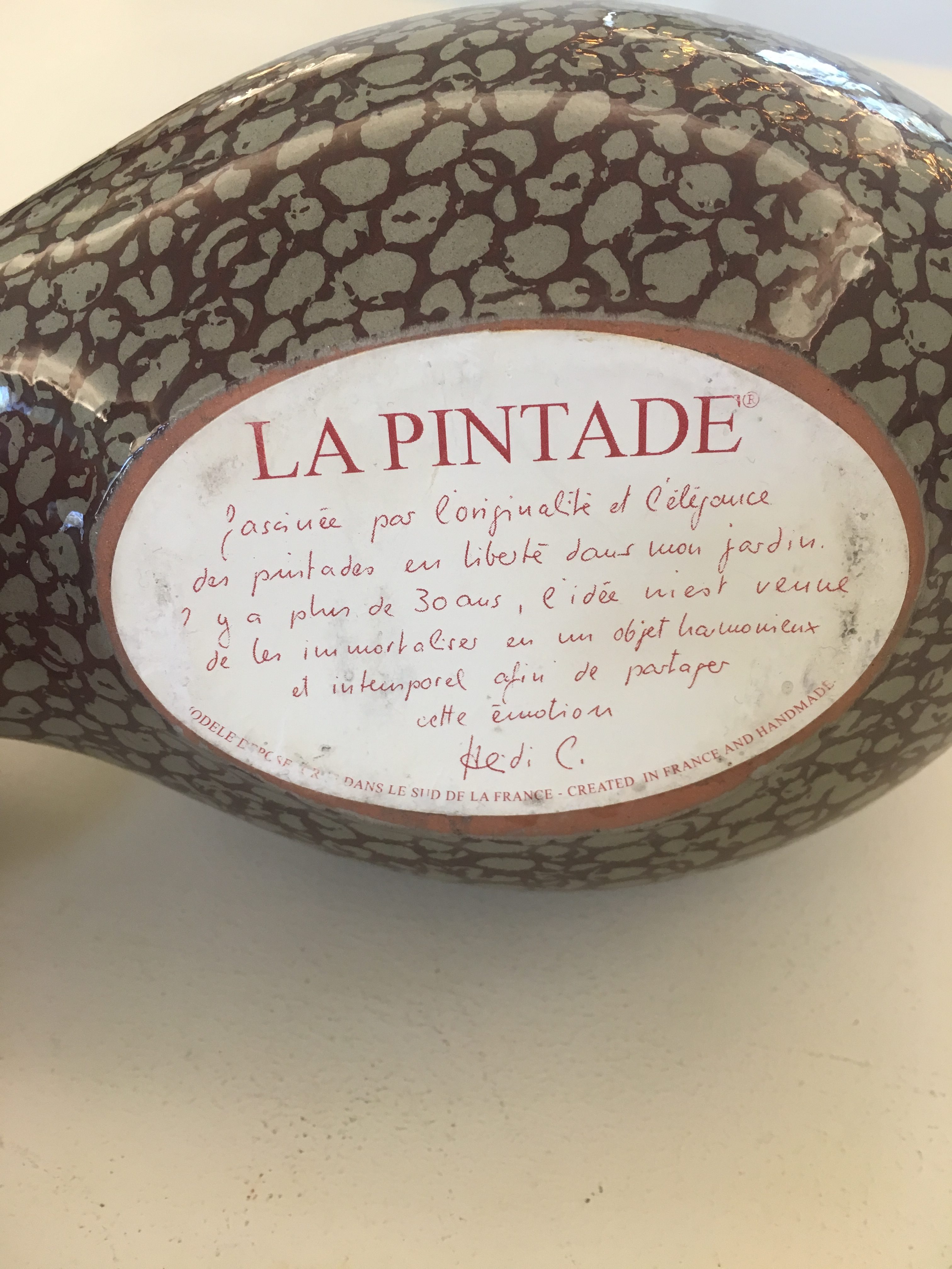 Hand painted ceramic object made and  by the artist Heidi Caillard, representing a Guinea hen.