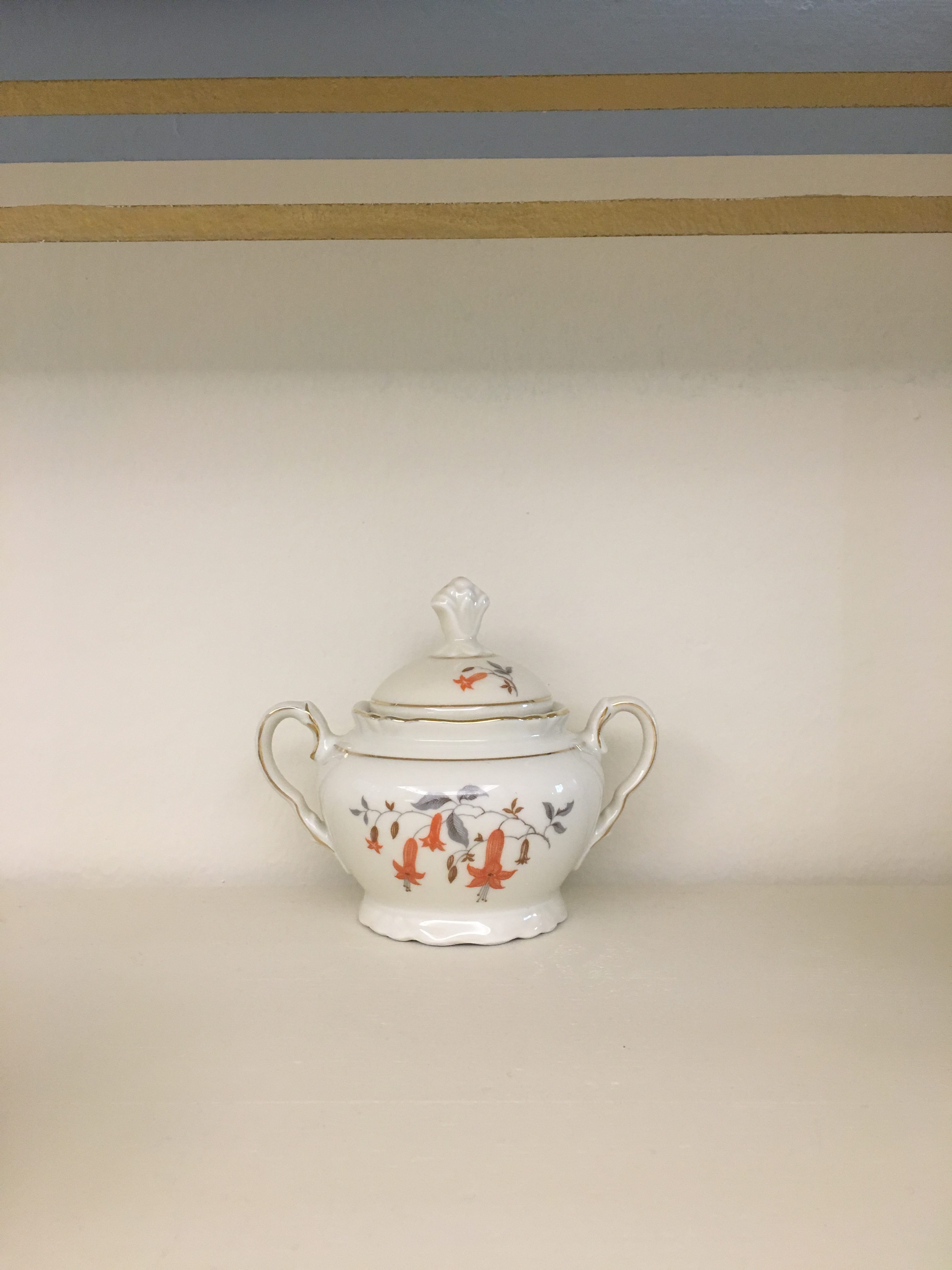Bavaria tea set in porcelain decorated with floral drawings in shades of gray and orange, profiled with gold edge.