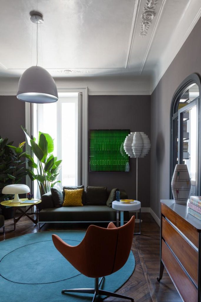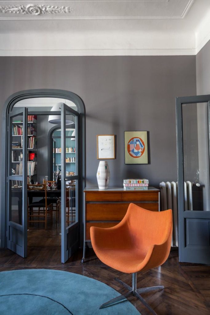 In primo piano poltroncina arancione Basket di Vico Magistretti per De Padova, in fondo a destra lampada da terra anni ’70 a lamine di metallo e divano Solo di B&B Italia