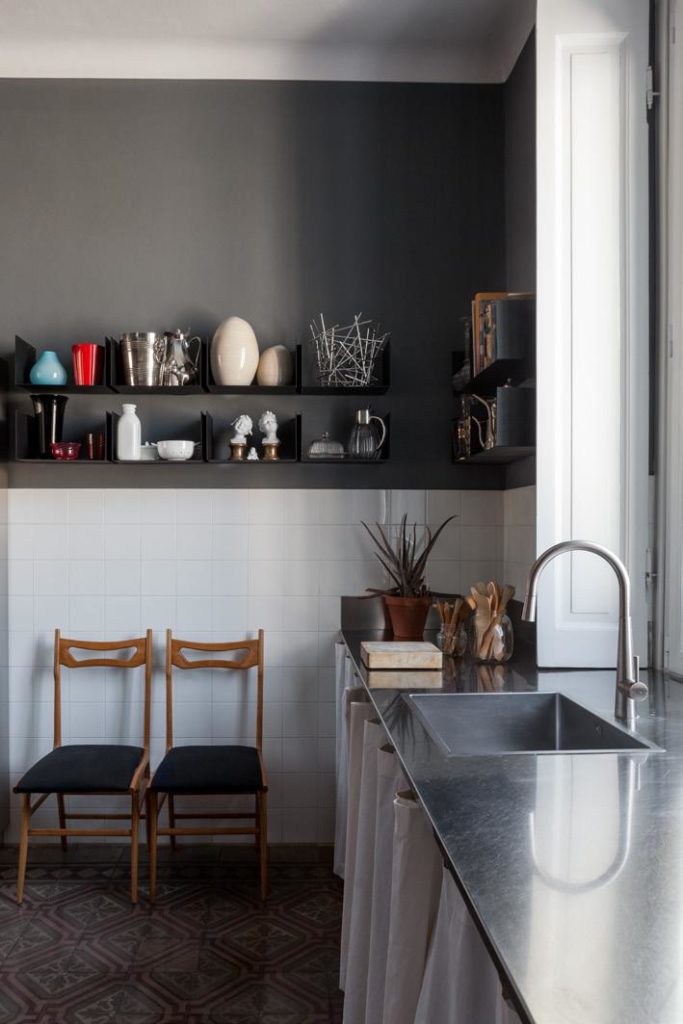 Piano di lavoro e lavello in acciaio affiancati da una coppia di sedie anni ’50