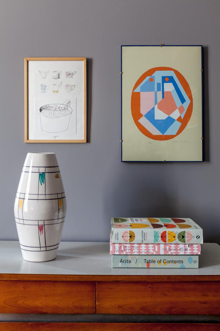 Cassettiera anni ’50 con vaso West Bay; disegno di Ugo La Pietra e tempera di Mario Radice