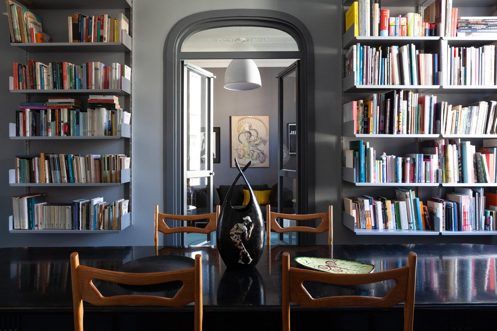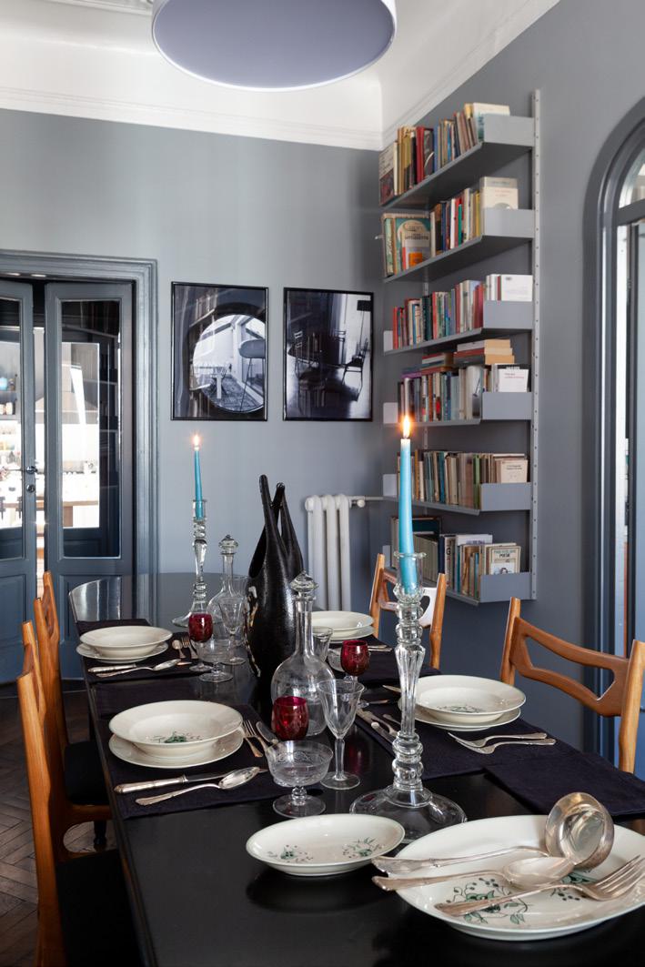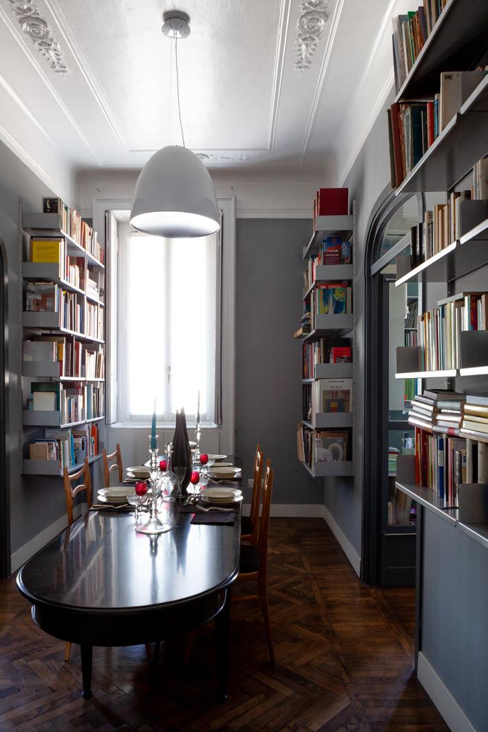 La luce filtra dal vetro trasparente delle porte, accende il colore degli arredi e gioca attraverso il cristallo dei bicchieri quando il lungo tavolo è apparecchiato per gli ospiti. Si respira un’atmosfera ariosa e accogliente da Roberto Radisa, a partire dai tre ambienti diurni (il soggiorno, la sala da pranzo e lo studio), collegati l’uno all’altro in sequenza. “Amo i vecchi parquet ma soprattutto le porte originali ad arco, un po’ più larghe del normale, che enfatizzano lo sguardo da una stanza all’altra. Stessa filosofia per le porte più piccole, le classiche milanesi a doppio battente, dove ho preferito sostitire i vetri satinati con altri trasparenti”, racconta l’architetto, arredatore, designer, conduttore di Cerco casa disperatamente su Real Time e, da poco, titolare di un negozio-galleria dedicato alla tavola. Siamo a Milano, zona Porta Venezia: “Mi sono innamorato di questo tipico palazzo anni ’20 per i decori eleganti ma non eccessivi, per il tocco sofisticato ma delicato nelle stanze e nei decori sui soffitti. Durante la ristrutturazione ho conservato quasi tutto, e rispettato l’impianto originale”. E’ stata solo invertita la posizione della cucina e camera da letto, che adesso sta in fondo alla casa, e si affaccia sulla sala da pranzo attraverso il corridoio. “Nelle case milanesi molto spesso la cucina non si doveva vedere troppo. Ora non più”. Qui c’è sempre un vaso con i fiori freschi, tra i libri e i numerosi servizi di piatti, bicchieri, stoviglie, posate d’argento. Il pavimento originale è perfettamente conservato: vecchie marmette in graniglia. In tutta la casa, di grande valore le opere d’arte (sculture di Giacomo Benevelli, quadri di Pino Urbano e Piero Prampolini) e gli arredi di design (Gio Ponti e Paolo Buffa, Marcel Breuer e Vico Magistretti, Dieter Rams e Guido Andlovitz). E poi, i mobili e i complementi anni ’50, e ancora ceramiche e porcellane, cristalli e vetri sapientemente soffiati, lavorati, torniti, e deliziosamente decorati.