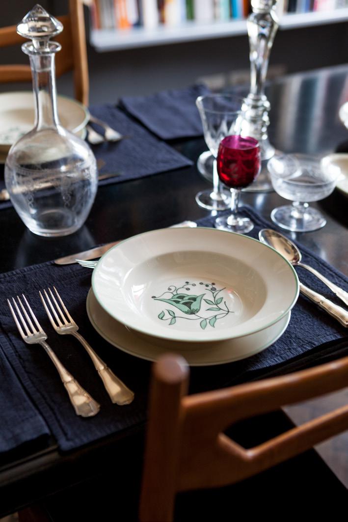 La tavola apparecchiata con bicchieri e brocche Liberty, posate in argento e servizio di piatti in porcellana di Laveno decorato su disegno di Guido Andlovitz