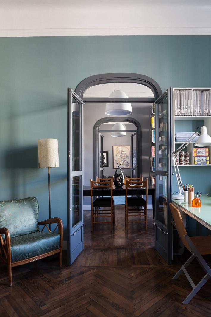 Particolare del soggiorno, da cui si gode la fuga prospettica degli altri ambienti, tutti giocati sui toni del blu e del verde