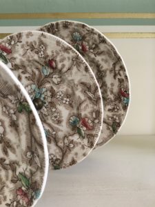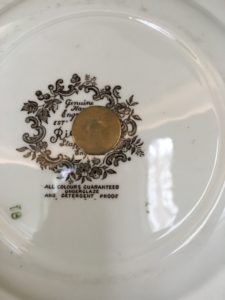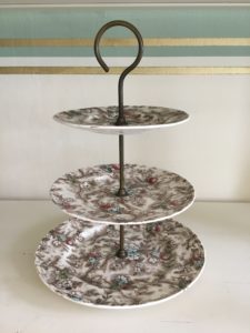 Alzatina a tre piani per dolci in porcellana inglese riccamente decorata, marchio Ridgeway England.