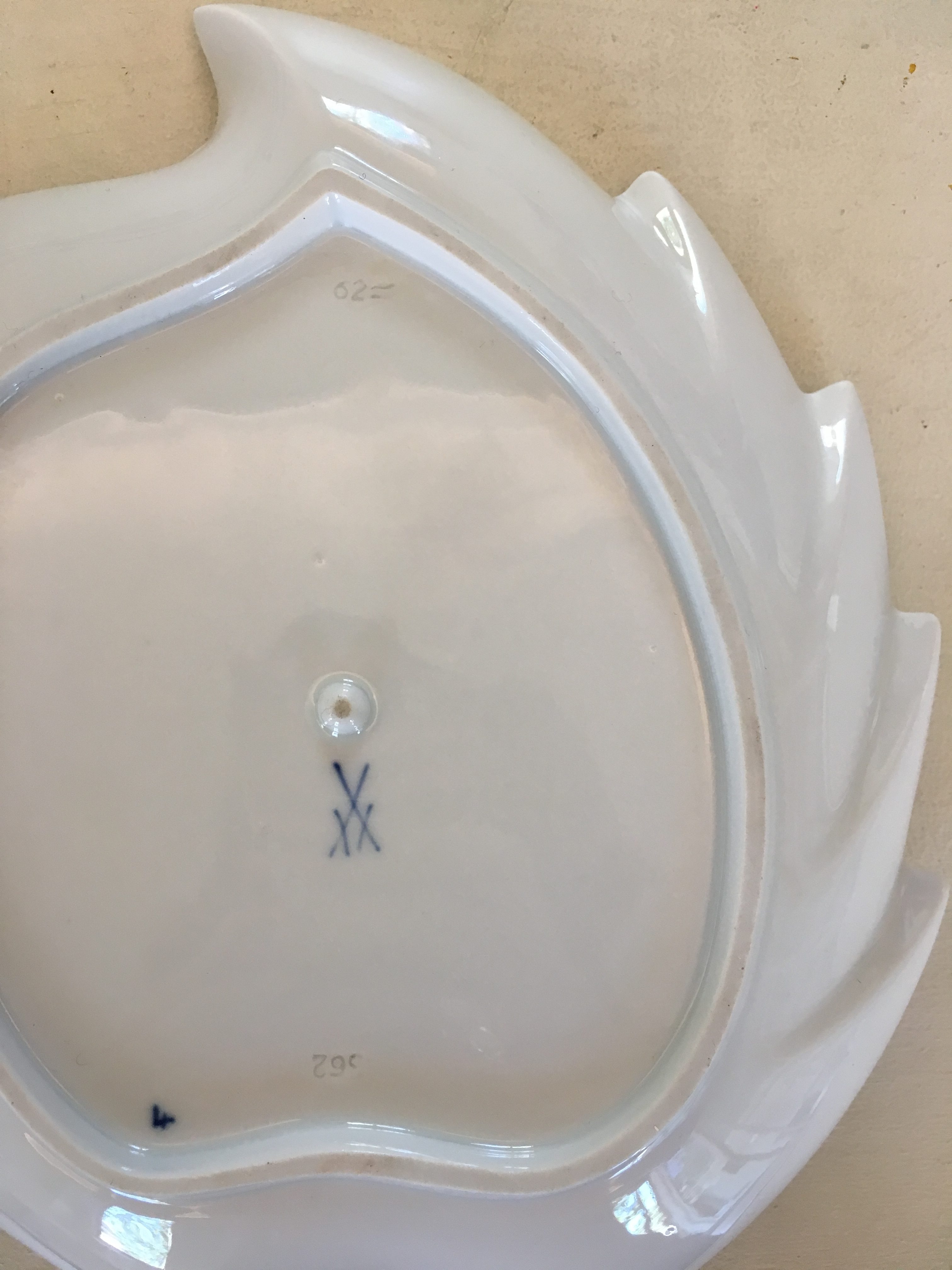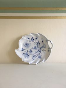 Ciotola a forma di foglia in porcellana marchio Meissen, decoro “blue onion”.