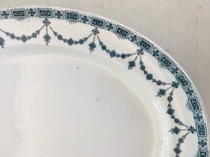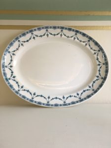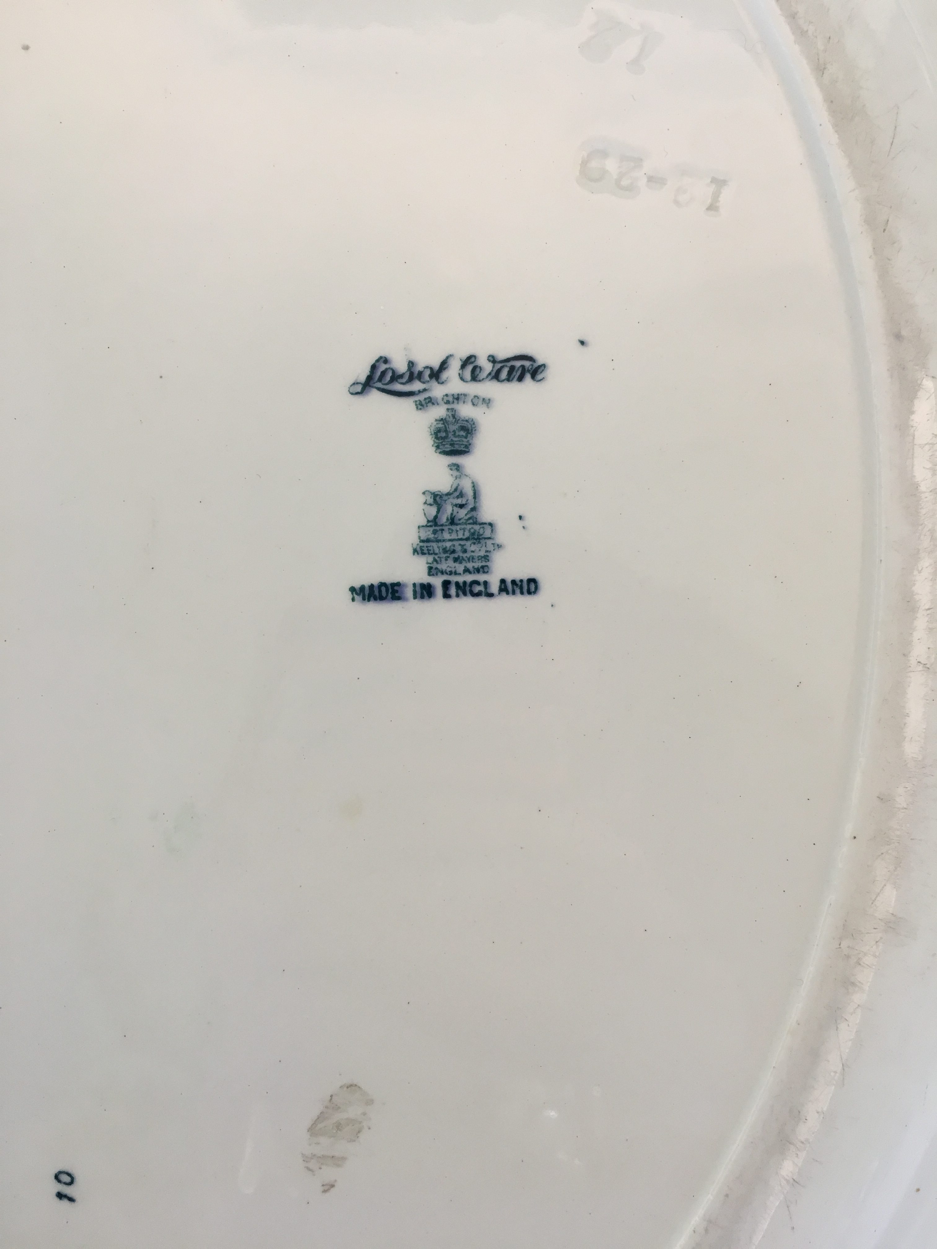 Piatto da portata, periodo vittoriano, marchio Losol Ware Brighton, decorato con delicati disegni sui toni del blu.