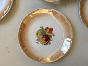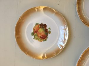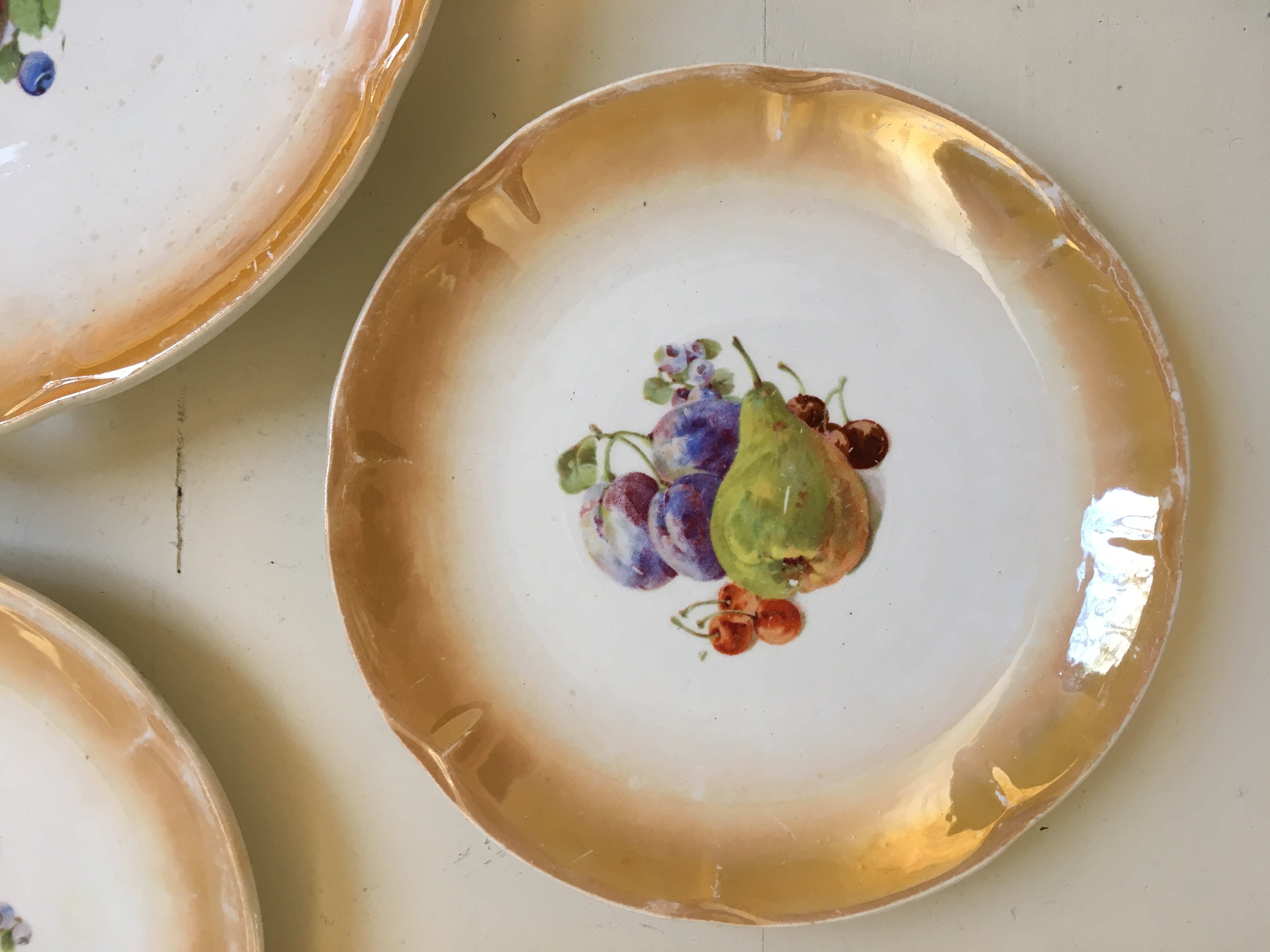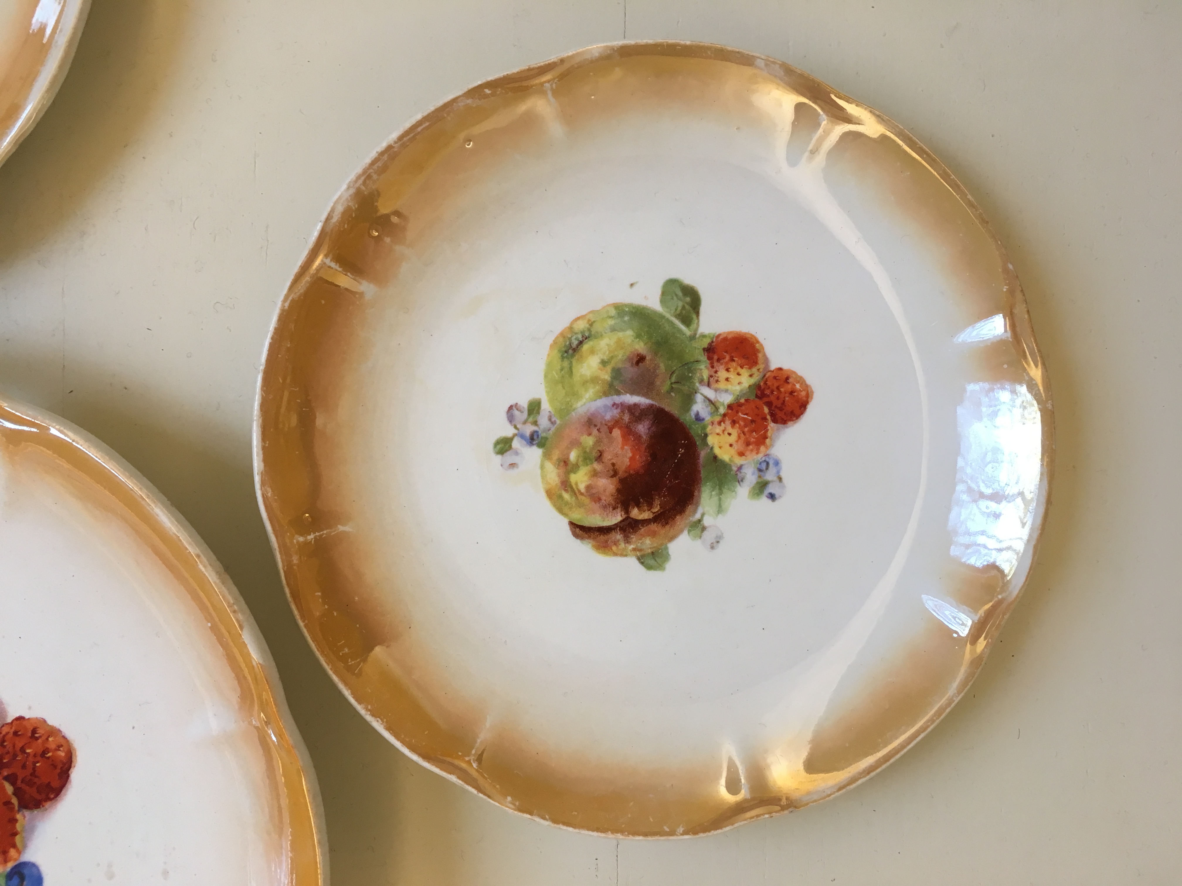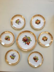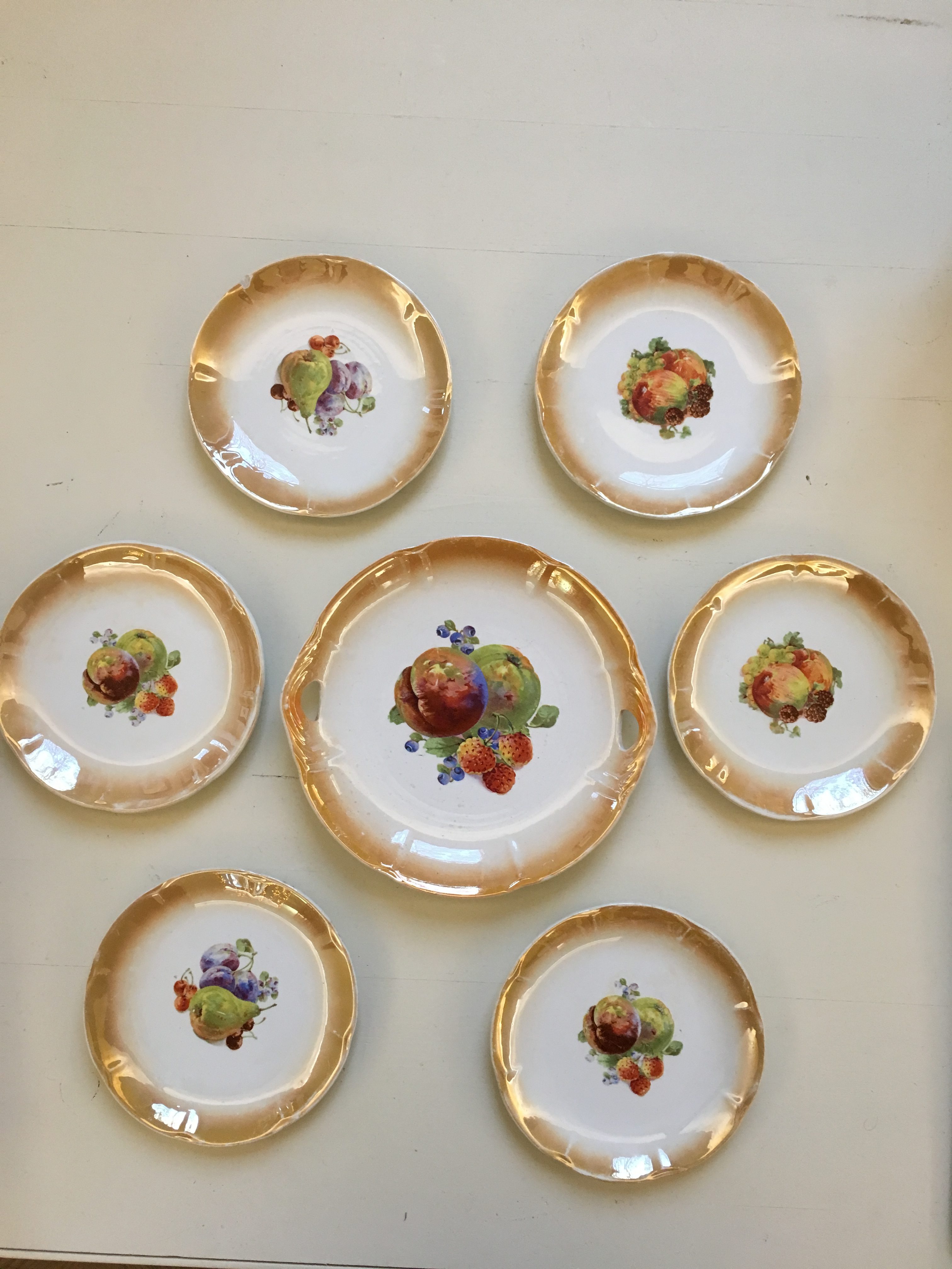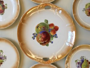 Servizio da frutta o da dessert in porcellana decorata a mano con disegni di frutti.