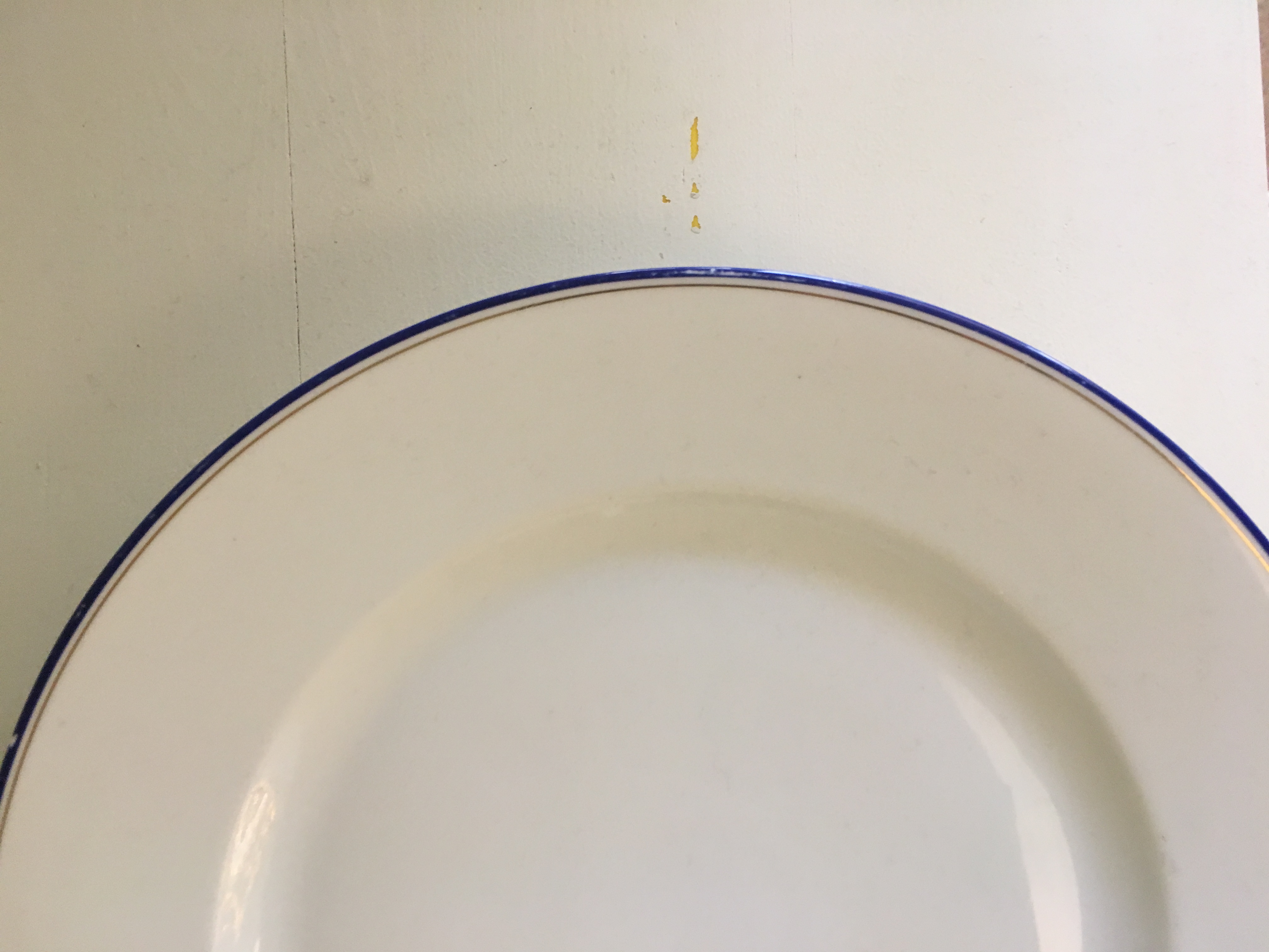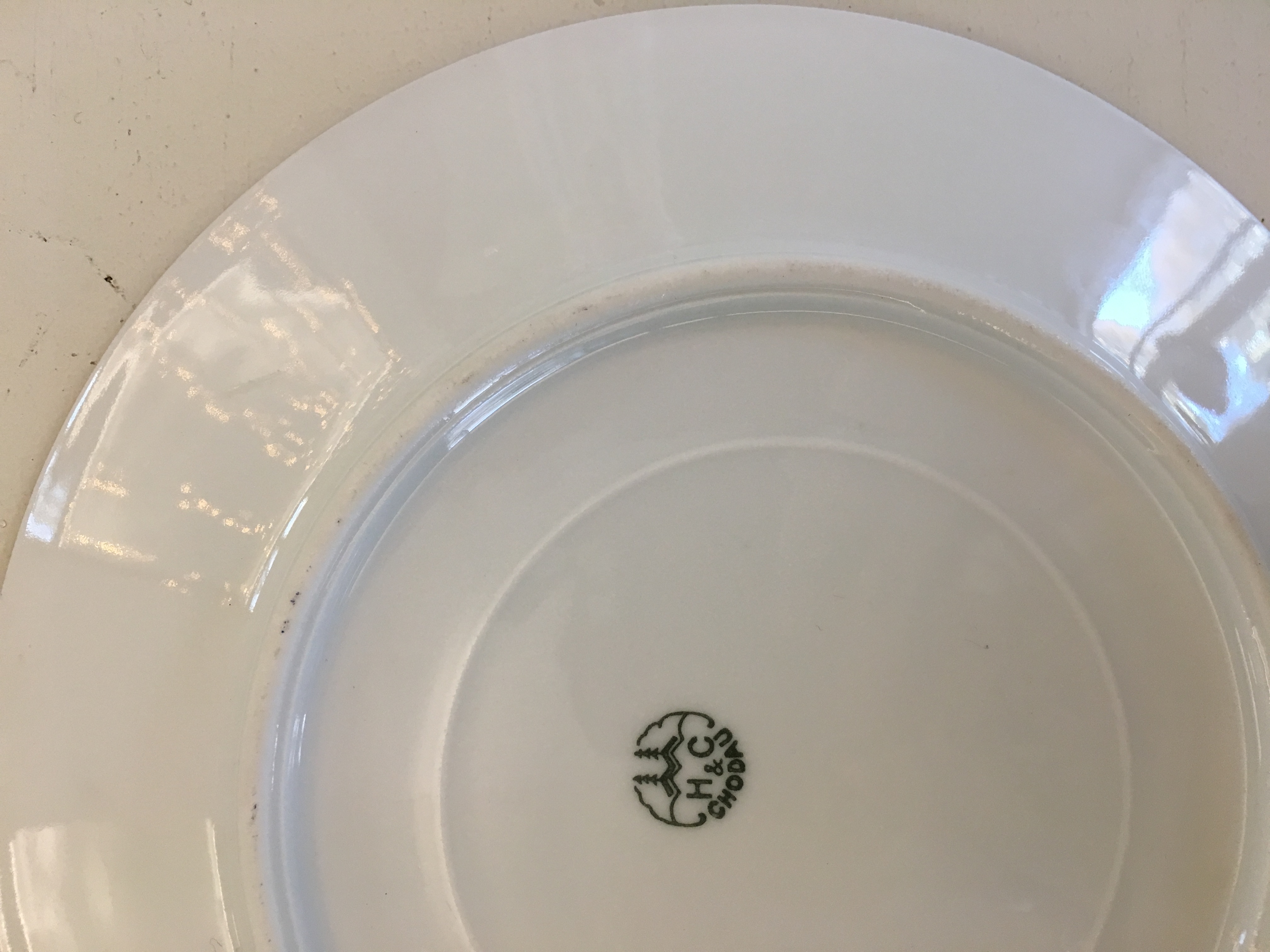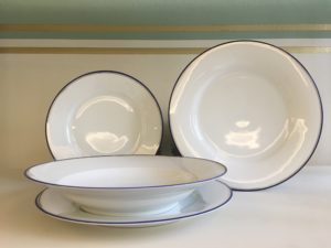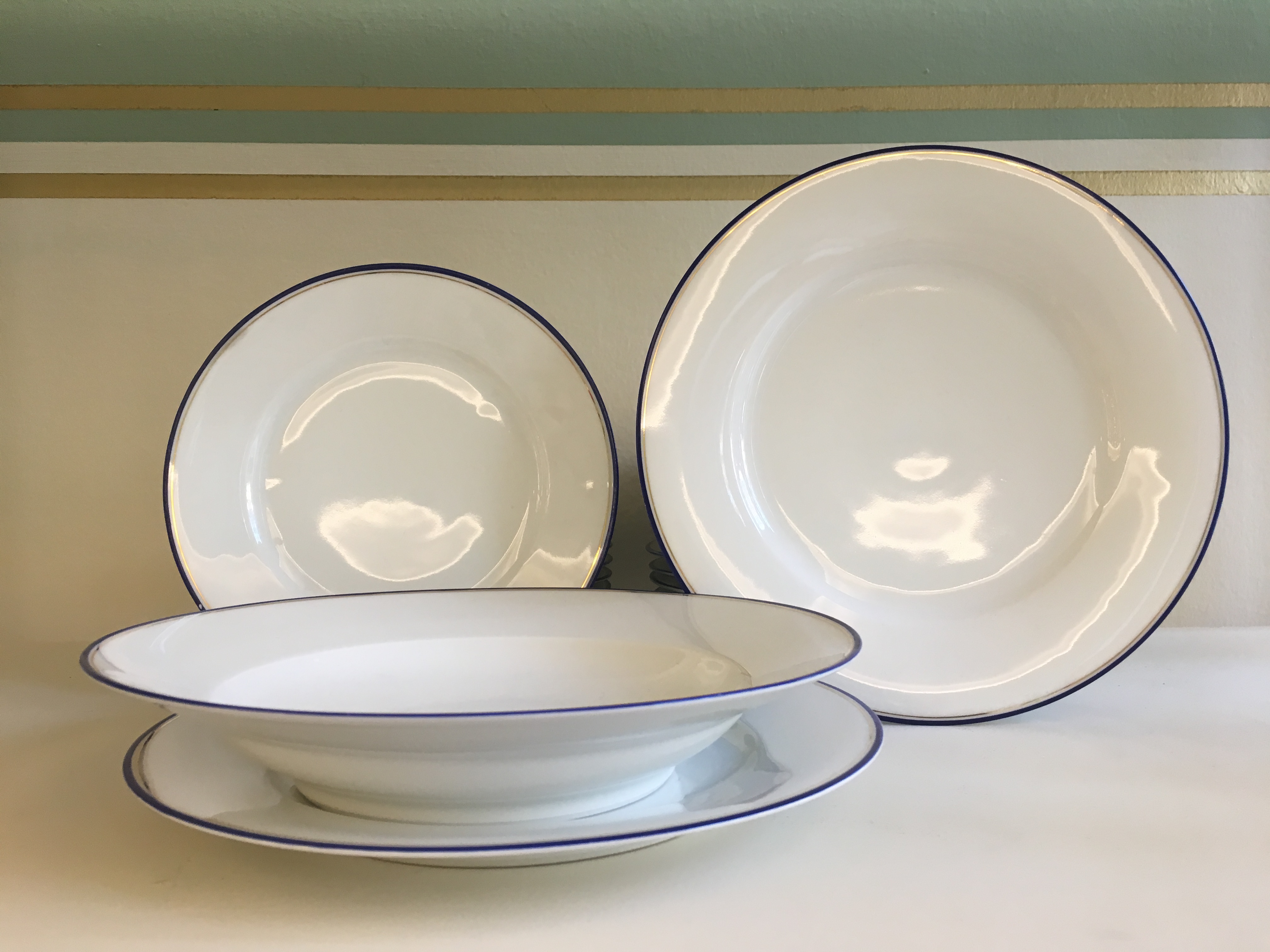 Servizio di piatti in porcellana bordato con fili oro e blu, marchio H&C Chodau.