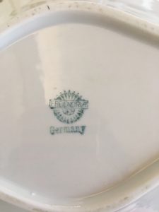 Set da portata in porcellana con bordo oro finemente decorata a mano con delicati fiori colorati. Marchio Freienorla Germany.
