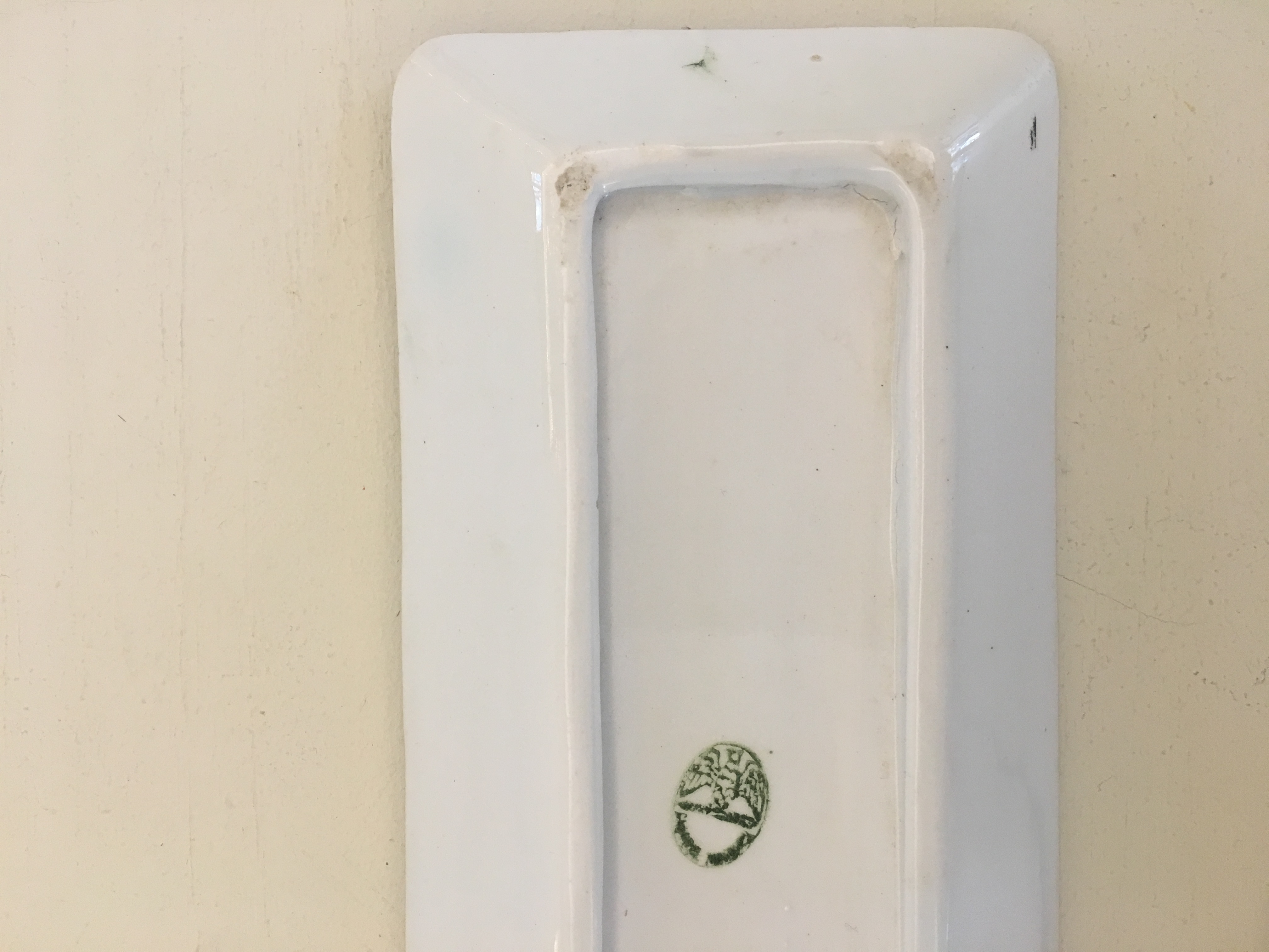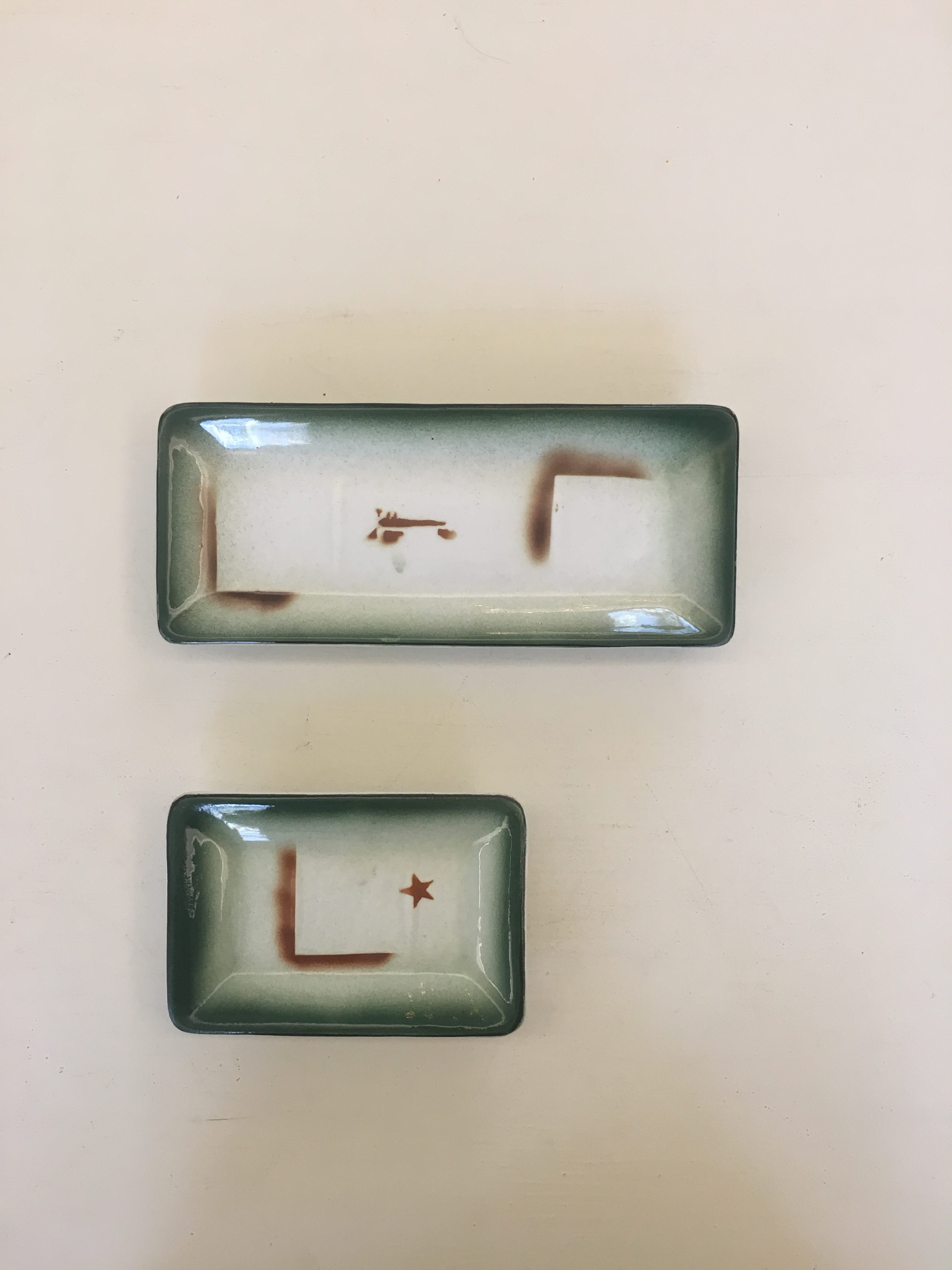 Set composto da due svuotatashe in ceramica decorata con disegni geometrici sui toni del verde e del marrone.