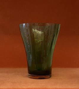 Vaso in cristallo verde a forma di tulipano con leggere modanature. Altezza 27 cm.
