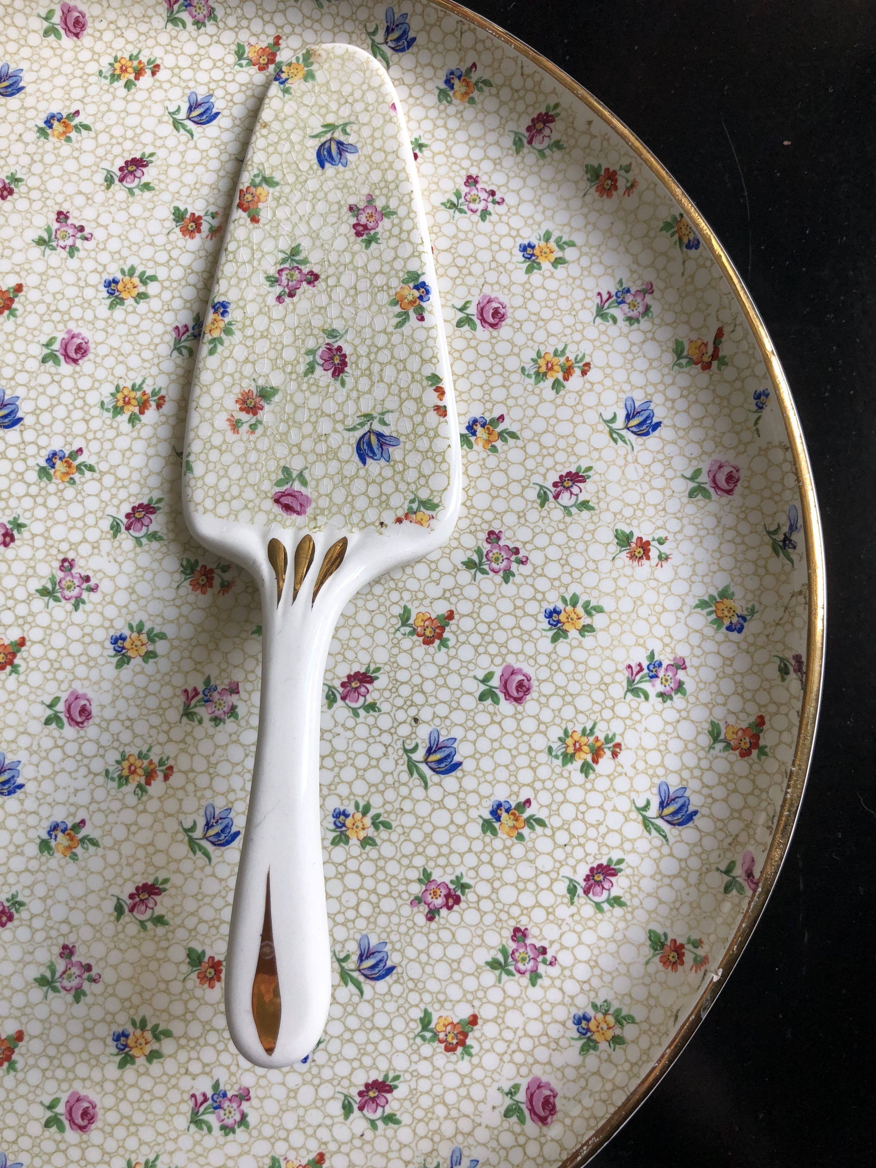 Grande vassoio con paletta per dolce, in porcellana di Gien, con piccoli decori floreali.